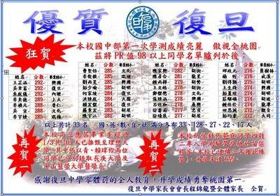 | 簡單描述 | 復旦國中部第一次基測成績 成績亮麗 傲視全桃園 PR值98以上有33人 其中有三人高達292分 | ||||