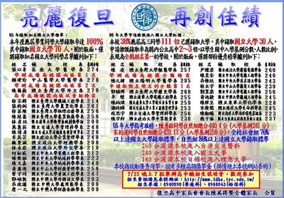 | 詳細報導 | 本校國中部96年第二次基測放榜,成績亮麗,本校國中部基測成績揭曉後,其中280分,PR值達97以上,共有67人,這些同學均可順利於第一階段,錄取全國各區第一志願,若按中國時報與聯合報今日考情預估報導:275分即可錄取武陵高中,本校將有71位同學可錄取第一志願武陵高中,此項成績比去年51位同學錄取第一志願武陵高中的成績大幅成長40%,再創復旦錄取第一志願的學校記錄。其次,本校PR值達90以上人數共有193人,約佔全校考生的4成。 大學基本學力測驗成績、大學指定考試成績,日前均已公佈,本校成績優異,預估錄取國立大學上百人,台、清、交、成大、政大、醫科等一流大學之同學,將達30位以上,較去年升學一流大學的成績又再度的倍數成長,升學績效,倍受家長肯定,可喜可賀。 | ||||