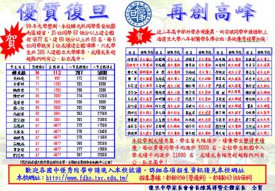 今年99年度大學學力測驗,復旦高中賴光啟同學獲得74級分,榮登桃園縣南區各高中榜首!另有黃柏堯同學獲得72級分,李齊明同學及魏偉哲同學獲得71級分,達67級分以上全國前5000名總計15名,雖然此15位同學當初入學國中基測平均排名只有12000名,卻都能考到全國前4660名,勝過許多縣內第一志願高中的大多數學生,能有如此優秀的表現,顯示復旦高中辦學的努力與績優,成效卓著。 相較於去年學測成績,今年本校各方面有大幅度的成長,不但總級分校平均達52級分,較去年成長了2級分,達公立大學錄取標準50級分共有206人,佔應屆高三同學百分之六十,而今年也有60人達到錄取全國一流校系60級分的標準,每6位同學即有1位同學成績達頂標(全國前12%)較去年增加五成;復旦高中的學生,依據國中基測入學時的PR值,程度排名平均為全國三十萬人中的前六萬名學生,但三年後的大學學測校平均排名,可達到全國排名四萬名之內,每位學生的程度較入學時有顯著的進步,可見復旦高中的教學能有效地提升學生程度,相較於其他第一志願高中學生,在高一入學時,皆為全國排名前一萬名的資優同學,但在三年後的學測,整體平均卻只能達到全國兩萬名的水準,復旦中學的學生「畢業皆比入學時還要優秀」,能有如此優異的辦學成績,放眼全桃園縣,只有復旦高中能有此顯著的成效。 近年來復旦高中辦理資優班成效卓越,第二屆數理班參與本次學測,雖然全班達第一志願標準入學的學生僅有9人,其他同學為縣內第二、三志願高中素質的學生,但全班41位同學大學學測班平均成績高達65級分,大幅超越縣內所有公、私立高中的校平均許多,去年更有資優班何安琪同學申請錄取上海復旦大學醫學系,充份表現出復旦高中的國際觀與競爭力! 目前復旦高中一年級已有23位學生棄選第一志願選讀復旦,顯示復旦高中學生素質不斷地逐年成長,歡迎勇於挑戰自我,追求卓越的國三同學選讀復旦高中,在三年後的大學升學表現必能大放異彩。 | ||||